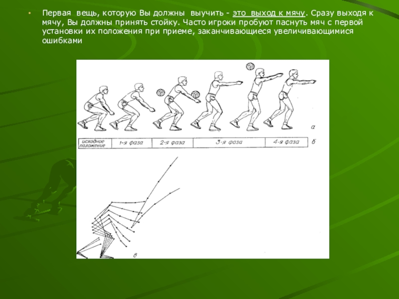 выходя к мячу, Вы должны принять стойку. Часто игроки пробуют паснуть мяч с первой установки их положения при приеме, заканчивающиеся увеличивающимися ошибками