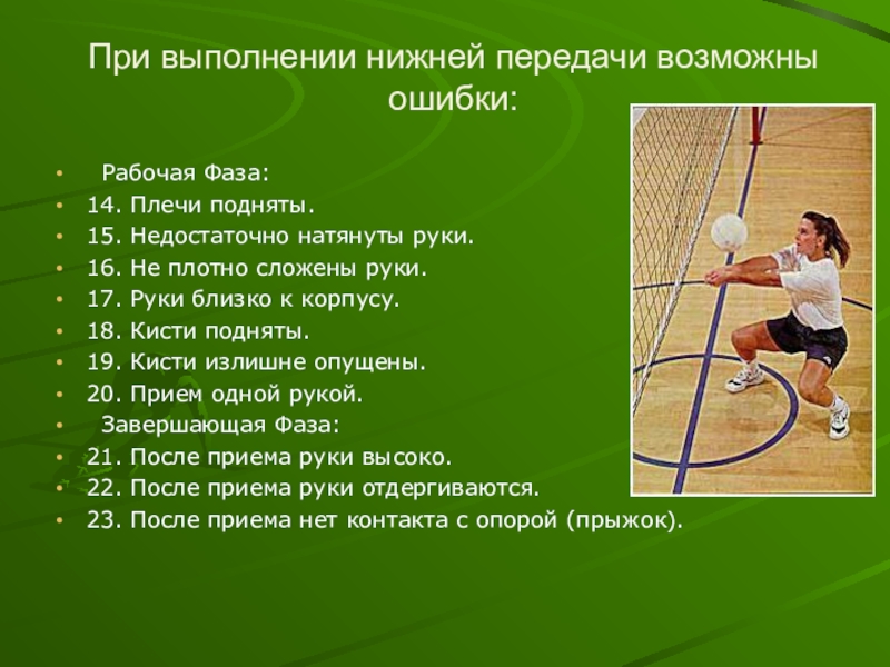 13. При приеме мяча в стороне не поднято наружное плечо.