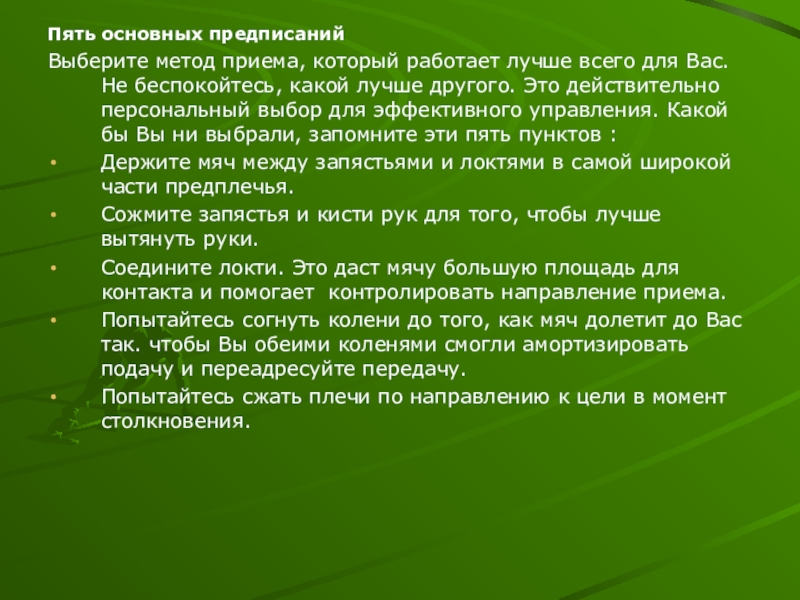 от защиты к нападению и возвращению подачи. Насколько хороший прием -часто диктует, как будет идти остальная часть игры. Команда, которая принимает эффективно, может последовательно бросать вызов любому противнику. Каждый игрок должен овладеть приемом, пока это не станет его врожденным качеством.
