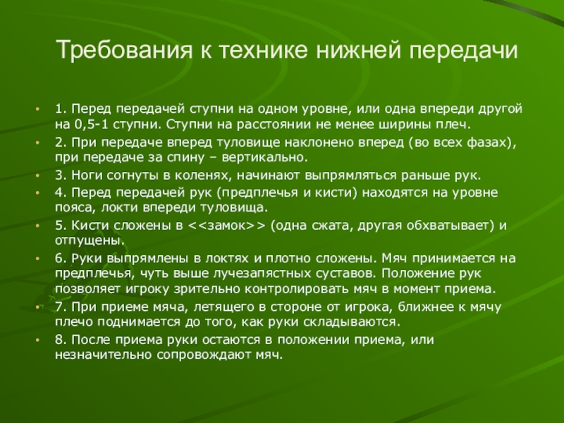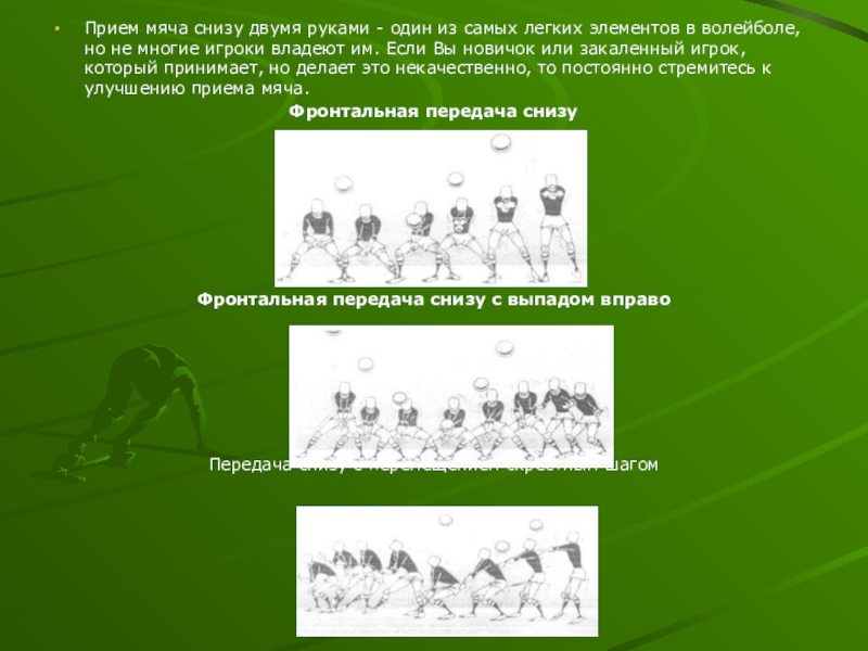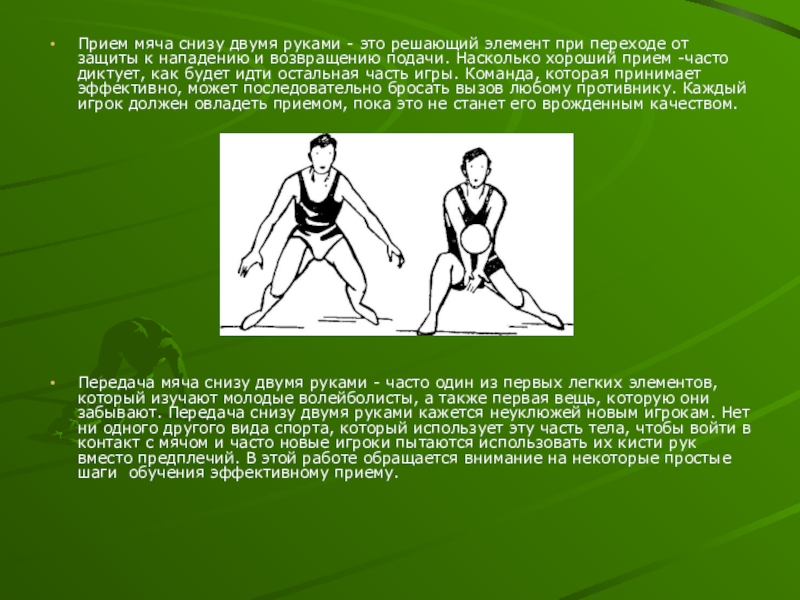 Передача мяча снизу двумя руками - часто один из первых легких элементов, который изучают молодые волейболисты, а также первая вещь, которую они забывают. Передача снизу двумя руками кажется неуклюжей новым игрокам. Нет ни одного другого вида спорта, который использует эту часть тела, чтобы войти в контакт с мячом и часто новые игроки пытаются использовать их кисти рук вместо предплечий. В этой работе обращается внимание на некоторые простые шаги обучения эффективному приему.
