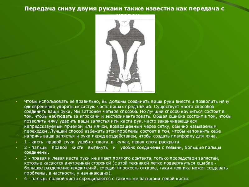 её правильно, Вы должны соединить ваши руки вместе и позволить мячу одновременно ударить мясистую часть ваших предплечий. Существует много способов соединить ваши руки, Мы затронем четыре способа. Но лучший cпocoб научиться состоит в том, чтобы наблюдать за игроками и экспериментировать. Общая ошибка состоит в том, чтобы позволить мячу ударить ваши запястья или кисти рук, часто заканчивающиеся непредсказуемым приемом или мячом, возвращенным через сетку, обычно называемым переходом. Лучший способ избежать этой проблемы состоит в том, чтобы напомнить себе напрячь ваши запястья и руки перед воздействием, чтобы создать платформу для мяча.