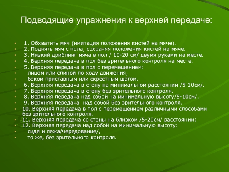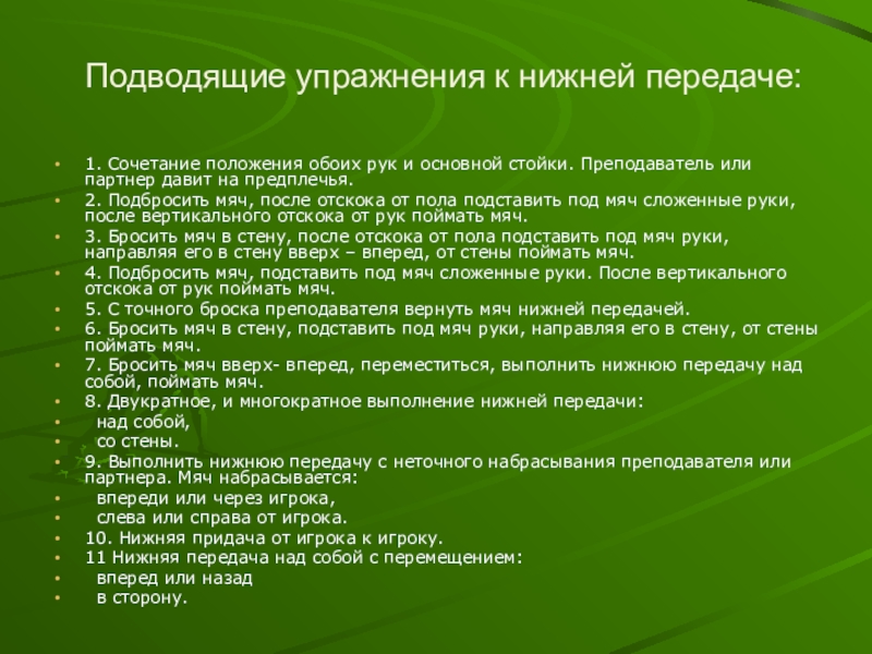 9. Выполнить нижнюю передачу с неточного набрасывания преподавателя или партнера. Мяч набрасывается: