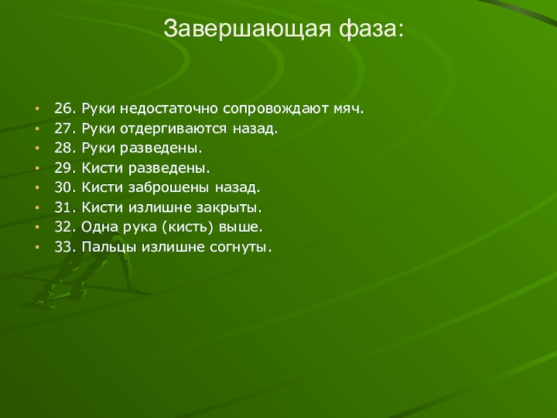 8. В завершающей фазе, движение рук, пальцев и кистей продолжается по инерции, затем оно мягко угасает. Руки, кисти и пальцы располагаясь симметрично, показывают направление вылета мяча.
