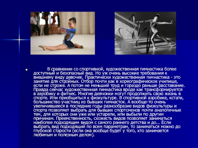 Но уж очень высокие требования к внешнему виду девочек. Практически художественная гимнастика - это занятие для стройных. Отбор почти как в хореографическое училище, если не строже. А потом не меньший труд и гораздо раньше расставание. Правда сейчас художественная гимнастика вроде как трансформируется в аэробику и фитнес. Многие девчонки могут продолжить свою жизнь в спорте. Или приобщиться к физкультуре. В спортивной аэробике, кстати, большинство участниц из бывших гимнасток. А вообще-то очень увеличившееся в последние годы разнообразие видов физкультуры и спорта позволяет выбрать для бывших спортсменов почти аналогичные тем, для которых они уже или устарели, или выбыли по другим причинам. Преемственность, схожесть видов позволяет заниматься наиболее подходящим видом с самого раннего детства и до... Если выбрать вид подходящий по всем параметрам, то заниматься можно до глубокой старости (если она вообще будет у того, кто занимается любимым и полезным делом).