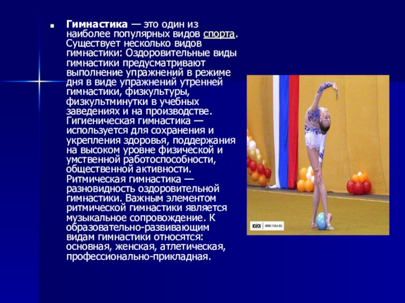 Слайд 2Гимнастика — это один из наиболее популярных видов спорта. Существует несколько