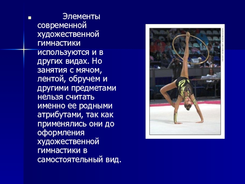 Слайд 6          Элементы современной художественной гимнастики используются и в других видах. Но занятия