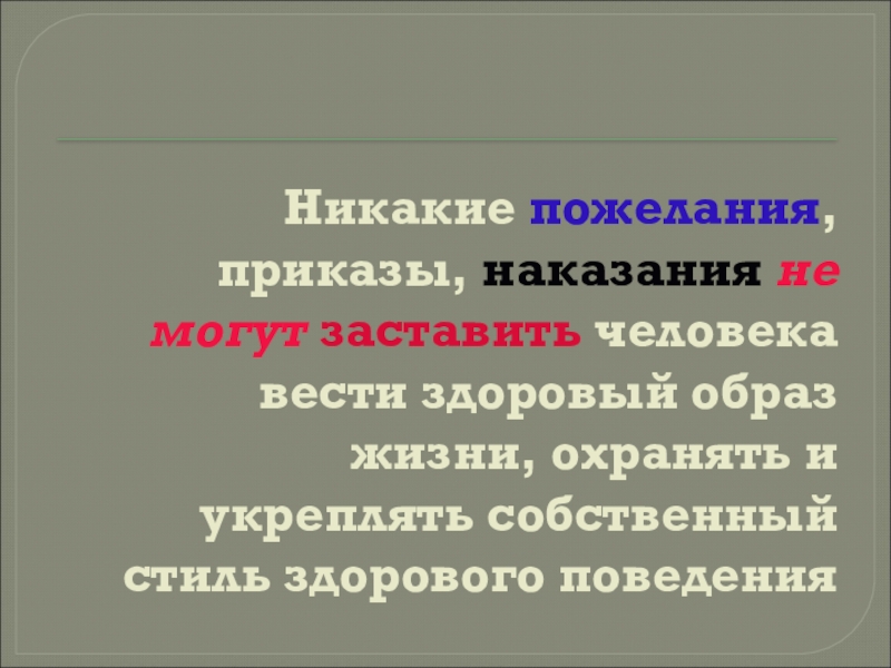 Слайд 8Никакие пожелания, приказы, наказания не могут заставить человека вести здоровый образ