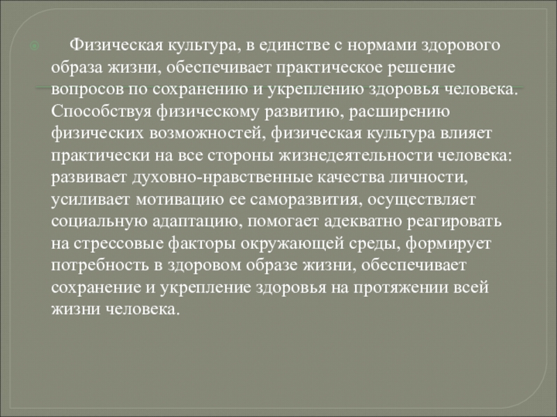 обеспечивает практическое решение вопросов по сохранению и укреплению здоровья человека. Способствуя физическому развитию, расширению физических возможностей, физическая культура влияет практически на все стороны жизнедеятельности человека: развивает духовно-нравственные качества личности, усиливает мотивацию ее саморазвития, осуществляет социальную адаптацию, помогает адекватно реагировать на стрессовые факторы окружающей среды, формирует потребность в здоровом образе жизни, обеспечивает сохранение и укрепление здоровья на протяжении всей жизни человека.