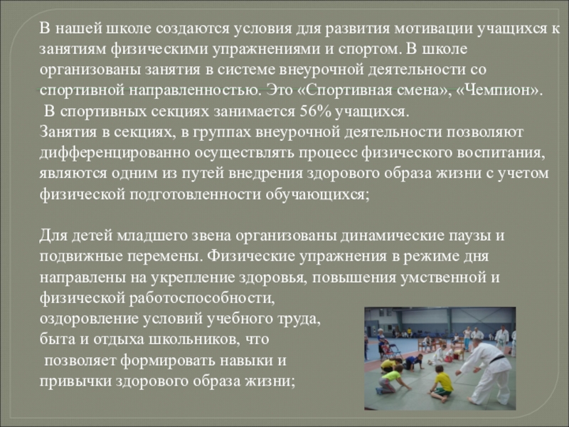 физическими упражнениями и спортом. В школе организованы занятия в системе внеурочной деятельности со спортивной направленностью. Это «Спортивная смена», «Чемпион».