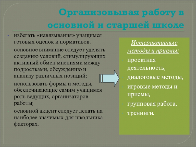 основное внимание следует уделять созданию условий, стимулирующих активный обмен мнениями между подростками, обсуждению и анализу различных позиций;