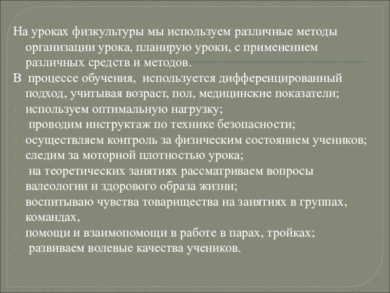 Слайд 14На уроках физкультуры мы используем различные методы организации урока, планирую уроки,