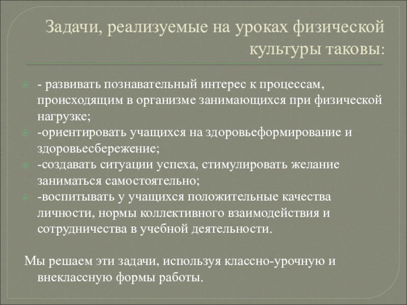 Мы решаем эти задачи, используя классно-урочную и внеклассную формы работы.