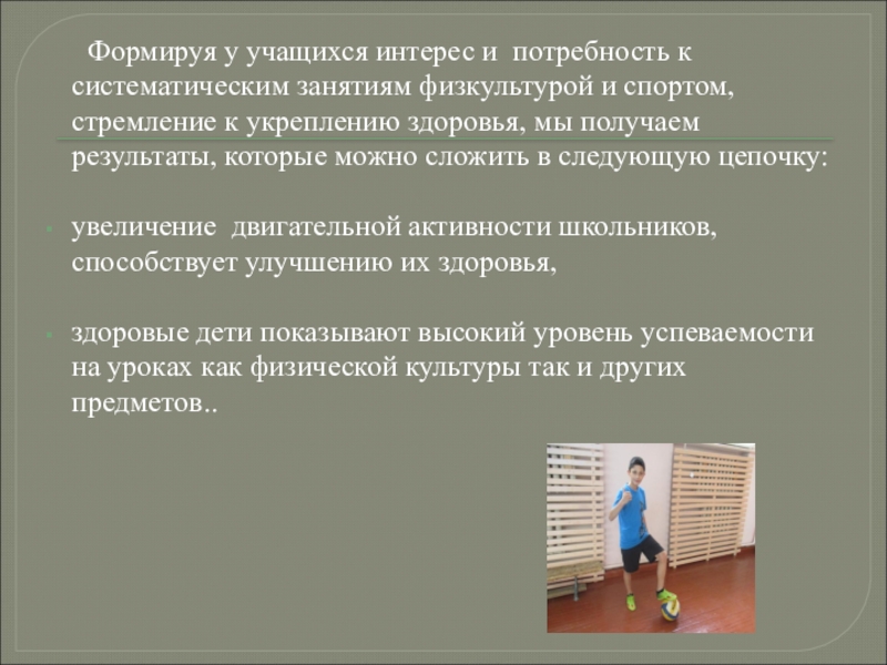 занятиям физкультурой и спортом, стремление к укреплению здоровья, мы получаем результаты, которые можно сложить в следующую цепочку: