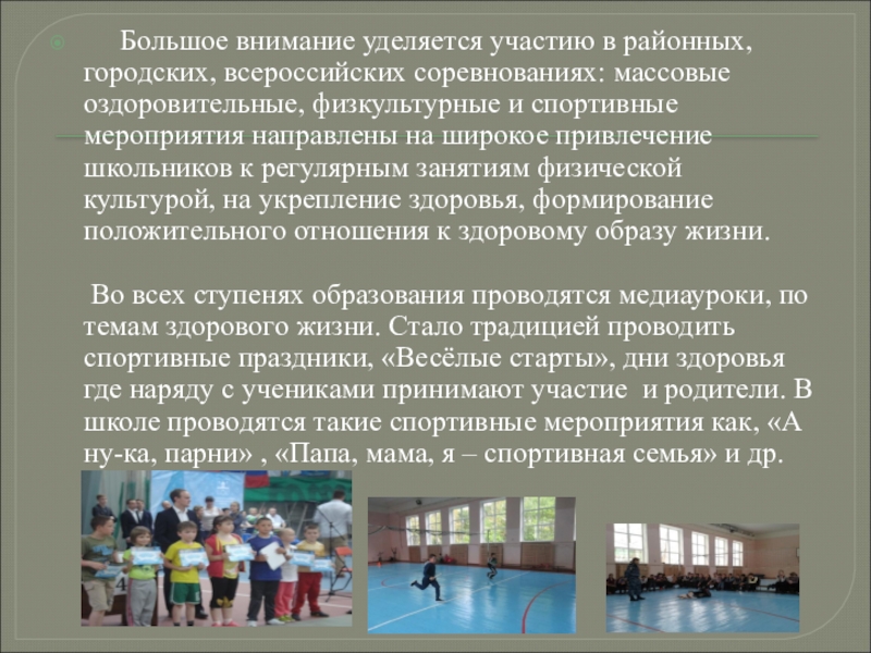 соревнованиях: массовые оздоровительные, физкультурные и спортивные мероприятия направлены на широкое привлечение школьников к регулярным занятиям физической культурой, на укрепление здоровья, формирование положительного отношения к здоровому образу жизни.