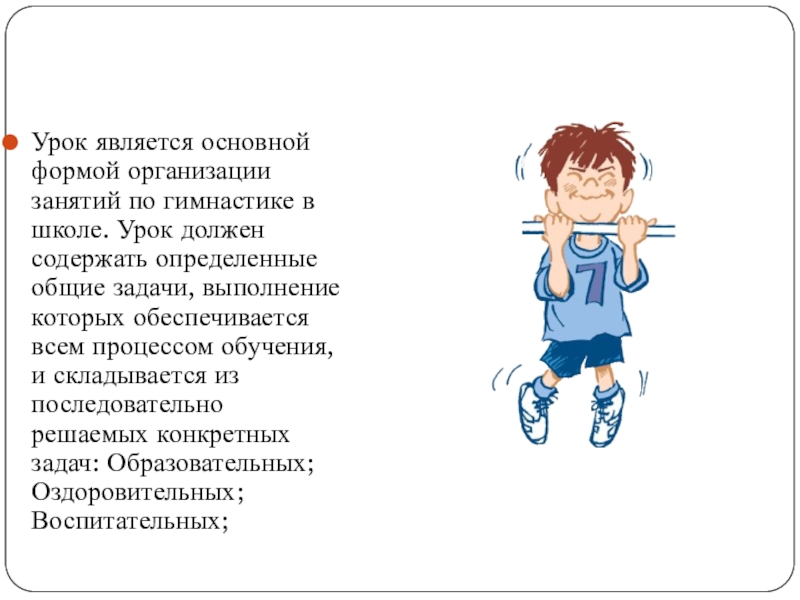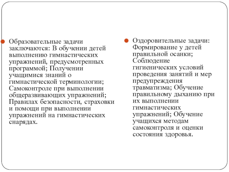 Оздоровительные задачи: Формирование у детей правильной осанки; Соблюдение гигиенических условий проведения занятий и мер предупреждения травматизма; Обучение правильному дыханию при их выполнении гимнастических упражнений; Обучение учащихся методам самоконтроля и оценки состояния здоровья.
