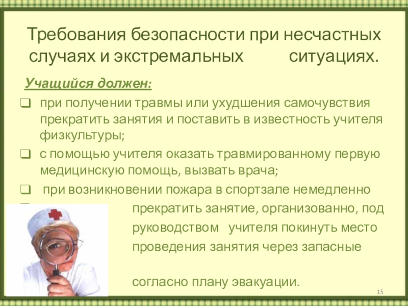 при получении травмы или ухудшения самочувствия прекратить занятия и поставить в известность учителя физкультуры;