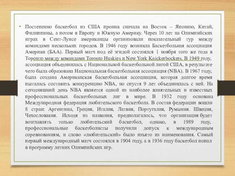 Филиппины, а потом в Европу и Южную Америку. Через 10 лет на Олимпийских играх в Сент-Луисе американцы организовали показательный тур между командами нескольких городов. В 1946 году возникла Баскетбольная ассоциация Америки (БAA). Первый матч под её эгидой состоялся 1 ноября того же года в Торонто между командами Toronto Huskies и New York Knickerbockers. В 1949 году, ассоциация объединилась с Национальной баскетбольной лигой США, в результате чего была образована Национальная баскетбольная ассоциация (NBA). В 1967 году, была создана Американская баскетбольная ассоциация, которая долгое время пыталась составить конкуренцию NBA, но спустя 9 лет объединилась с ней. На сегодняшний день NBA является одной из наиболее влиятельных и известных профессиональных баскетбольных лиг в мире. В 1932 году основана Международная федерация любительского баскетбола. В состав федерации вошли 8 стран: Аргентина, Греция, Италия, Латвия, Португалия, Румыния. Швеция, Чехословакия. Исходя из названия, предполагалось, что организация будет возглавлять только любительский баскетбол, однако, в 1989 году, профессиональные баскетболисты получили допуск к международным соревнованиям, и слово «любительский» было изъято из наименования. Самый первый международный матч состоялся в 1904 году, а в 1936 году баскетбол попал в программу летних Олимпийских игр.