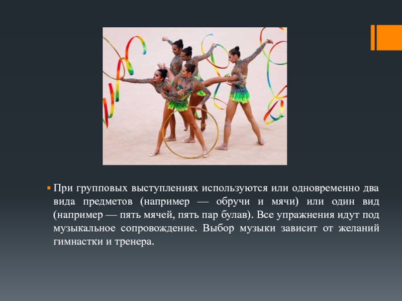Слайд 13При групповых выступлениях используются или одновременно два вида предметов (например —