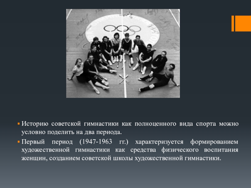 Первый период (1947-1963 гг.) характеризуется формированием художественной гимнастики как средства физического воспитания женщин, созданием советской школы художественной гимнастики.