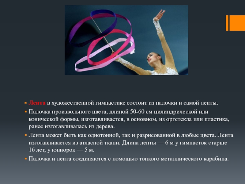 Лента может быть как однотонной, так и разрисованной в любые цвета. Лента изготавливается из атласной ткани. Длина ленты — 6 м у гимнасток старше 16 лет, у юниорок — 5 м.
