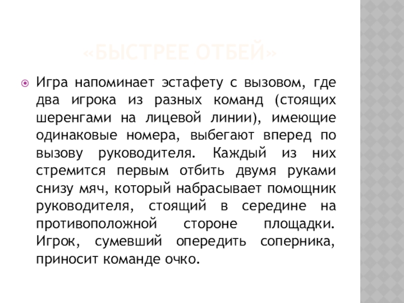команд (стоящих шеренгами на лицевой линии), имеющие одинаковые номера, выбегают вперед по вызову руководителя. Каждый из них стремится первым отбить двумя руками снизу мяч, который набрасывает помощник руководителя, стоящий в середине на противоположной стороне площадки. Игрок, сумевший опередить соперника, приносит команде очко.