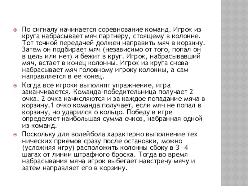 стоящему в колонне. Тот точной передачей должен направить мяч в корзину. Затем он подбирает мяч (независимо от того, попал он в цель или нет) и бежит в круг. Игрок, набрасывавший мяч, встает в конец колонны. Игрок из круга снова набрасывает мяч головному игроку колонны, а сам направляется в ее конец.