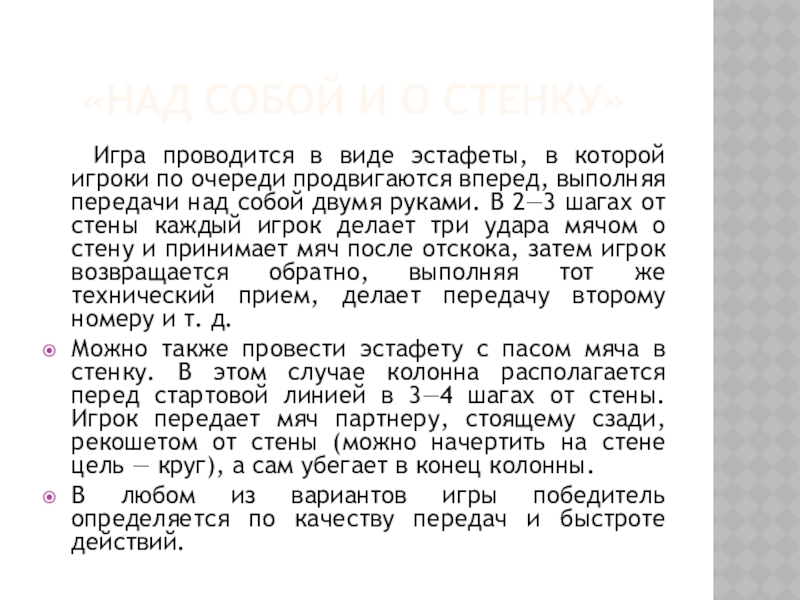 Можно также провести эстафету с пасом мяча в стенку. В этом случае колонна располагается перед стартовой линией в 3—4 шагах от стены. Игрок передает мяч партнеру, стоящему сзади, рекошетом от стены (можно начертить на стене цель — круг), а сам убегает в конец колонны.