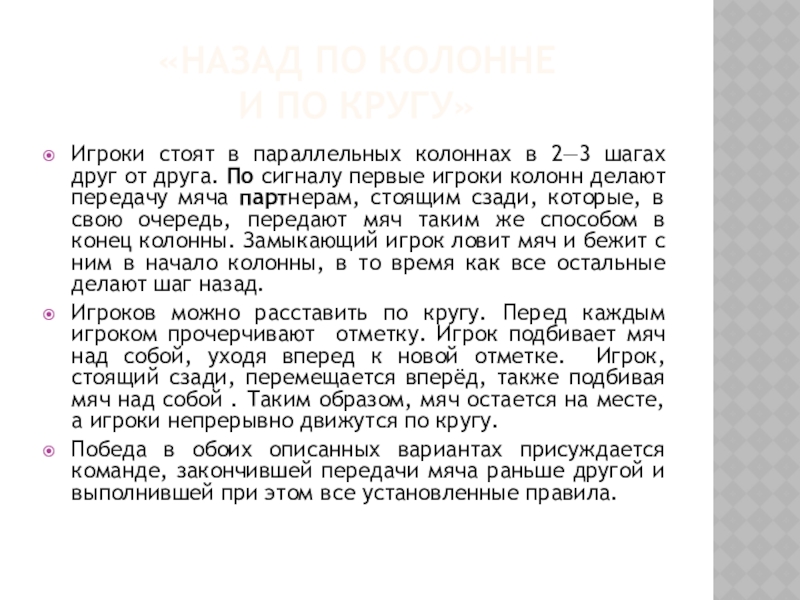 2—3 шагах друг от друга. По сигналу первые игроки колонн делают передачу мяча партнерам, стоящим сзади, которые, в свою очередь, передают мяч таким же способом в конец колонны. Замыкающий игрок ловит мяч и бежит с ним в начало колонны, в то время как все остальные делают шаг назад.