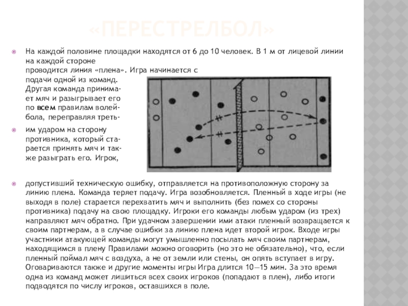 допустивший техническую ошибку, отправляется на противоположную сторону за линию плена. Команда теряет подачу. Игра возобновляется. Пленный в ходе игры (не выходя в поле) старается перехватить мяч и выполнить (без помех со стороны противника) подачу на свою площадку. Игроки его команды любым ударом (из трех) направляют мяч обратно. При удачном завершении ими атаки пленный возвращается к своим партнерам, а в случае ошибки за линию плена идет второй игрок. Входе игры участники атакующей команды могут умышленно посылать мяч своим партнерам, находящимся в плену Правилами можно оговорить (но это не обязательно), что, если пленный поймал мяч с воздуха, а не от земли или стены, он опять вступает в игру. Оговариваются также и другие моменты игры Игра длится 10—15 мин. За это время одна из команд может лишиться всех своих игроков (попадают в плен), либо итоги подводятся по числу игроков, оставшихся в поле.