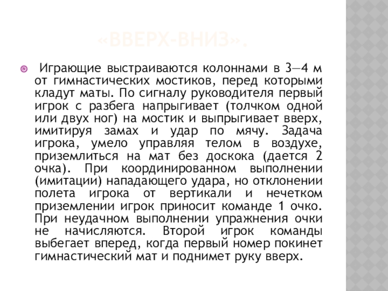 которыми кладут маты. По сигналу руководителя первый игрок с разбега напрыгивает (толчком одной или двух ног) на мостик и выпрыгивает вверх, имитируя замах и удар по мячу. Задача игрока, умело управляя телом в воздухе, приземлиться на мат без доскока (дается 2 очка). При координированном выполнении (имитации) нападающего удара, но отклонении полета игрока от вертикали и нечетком приземлении игрок приносит команде 1 очко. При неудачном выполнении упражнения очки не начисляются. Второй игрок команды выбегает вперед, когда первый номер покинет гимнастический мат и поднимет руку вверх.