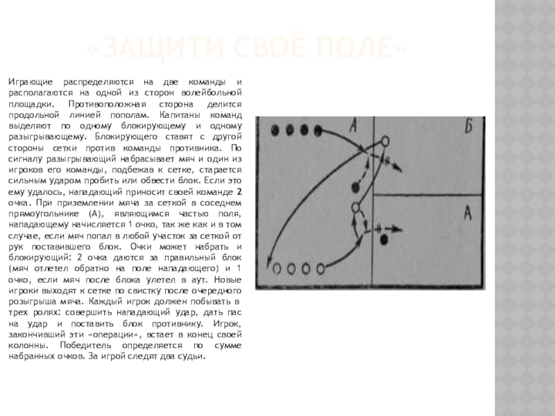из сторон волейбольной площадки. Противоположная сторона делится продольной линией пополам. Капитаны команд выделяют по одному блокирующему и одному разыгрывающему. Блокирующего ставят с другой стороны сетки против команды противника. По сигналу разыгрывающий набрасывает мяч и один из игроков его команды, подбежав к сетке, старается сильным ударом пробить или обвести блок. Если это ему удалось, нападающий приносит своей команде 2 очка. При приземлении мяча за сеткой в соседнем прямоугольнике (А), являющимся частью поля, нападающему начисляется 1 очко, так же как и в том случае, если мяч попал в любой участок за сеткой от рук поставившего блок. Очки может набрать и блокирующий: 2 очка даются за правильный блок (мяч отлетел обратно на поле нападающего) и 1 очко, если мяч после блока улетел в аут. Новые игроки выходят к сетке по свистку после очередного розыгрыша мяча. Каждый игрок должен побывать в трех ролях: совершить нападающий удар, дать пас на удар и поставить блок противнику. Игрок, закончивший эти «операции», встает в конец своей колонны. Победитель определяется по сумме набранных очков. За игрой следят два судьи.