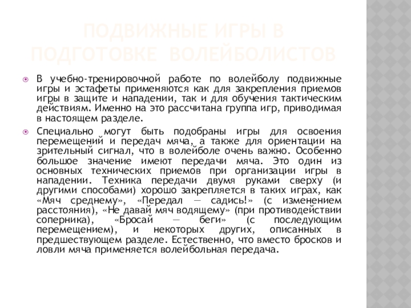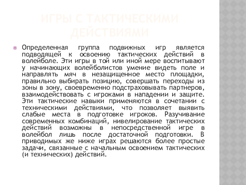 тактических действий в волейболе. Эти игры в той или иной мере воспитывают у начинающих волейболистов умение видеть поле и направлять мяч в незащищенное место площадки, правильно выбирать позицию, совершать переходы из зоны в зону, своевременно подстраховывать партнеров, взаимодействовать с игроками в нападении и защите. Эти тактические навыки применяются в сочетании с техническими действиями, что позволяет выявить слабые места в подготовке игроков. Разучивание современных комбинаций, нивелирование тактических действий возможны в непосредственной игре в волейбол лишь после достаточной подготовки. В приводимых же ниже играх решаются более простые задачи, связанные с начальным освоением тактических (и технических) действий.