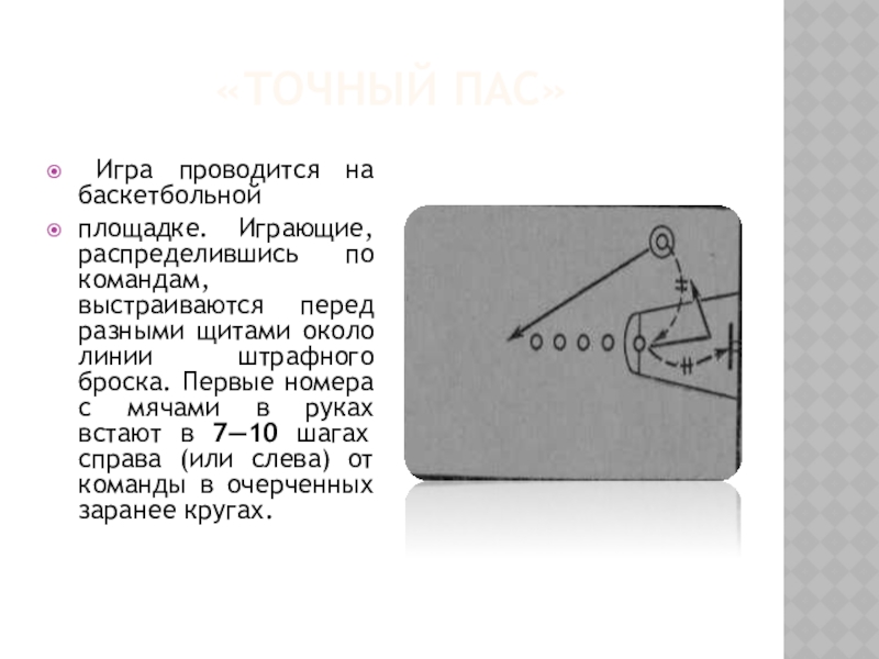 выстраиваются перед разными щитами около линии штрафного броска. Первые номера с мячами в руках встают в 7—10 шагах справа (или слева) от команды в очерченных заранее кругах.