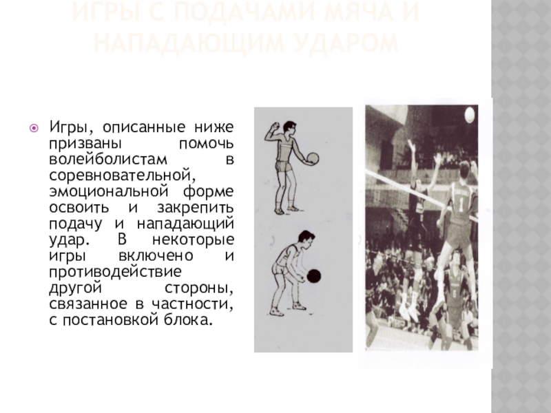 Слайд 15Игры с подачами мяча и нападающим ударом