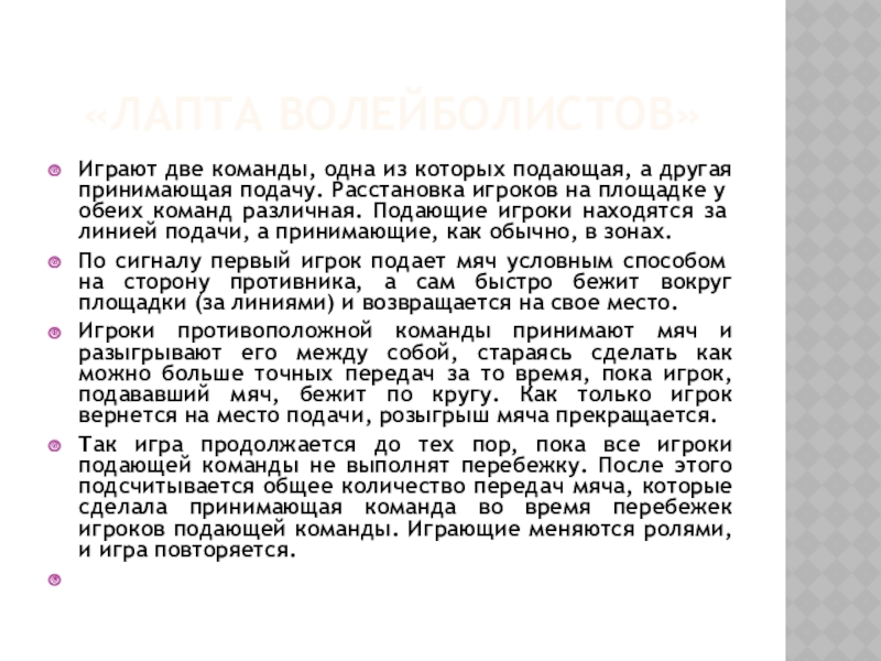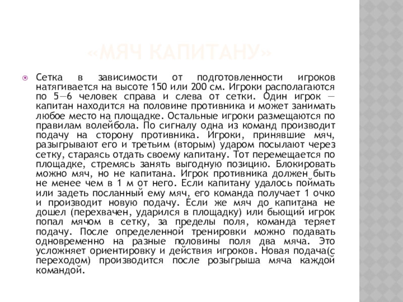 или 200 см. Игроки располагаются по 5—6 человек справа и слева от сетки. Один игрок — капитан находится на половине противника и может занимать любое место на площадке. Остальные игроки размещаются по правилам волейбола. По сигналу одна из команд производит подачу на сторону противника. Игроки, принявшие мяч, разыгрывают его и третьим (вторым) ударом посылают через сетку, стараясь отдать своему капитану. Тот перемещается по площадке, стремясь занять выгодную позицию. Блокировать можно мяч, но не капитана. Игрок противника должен быть не менее чем в 1 м от него. Если капитану удалось поймать или задеть посланный ему мяч, его команда получает 1 очко и производит новую подачу. Если же мяч до капитана не дошел (перехвачен, ударился в площадку) или бьющий игрок попал мячом в сетку, за пределы поля, команда теряет подачу. После определенной тренировки можно подавать одновременно на разные половины поля два мяча. Это усложняет ориентировку и действия игроков. Новая подача(с переходом) производится после розыгрыша мяча каждой командой.