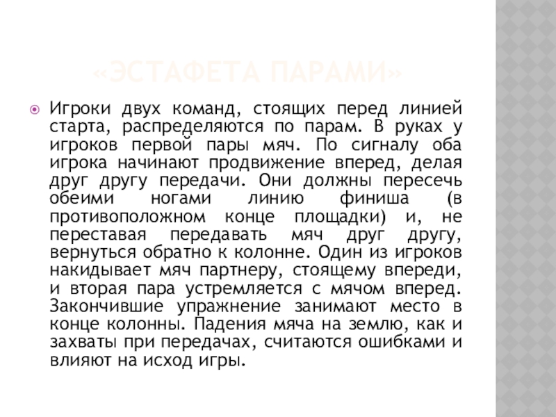 парам. В руках у игроков первой пары мяч. По сигналу оба игрока начинают продвижение вперед, делая друг другу передачи. Они должны пересечь обеими ногами линию финиша (в противоположном конце площадки) и, не переставая передавать мяч друг другу, вернуться обратно к колонне. Один из игроков накидывает мяч партнеру, стоящему впереди, и вторая пара устремляется с мячом вперед. Закончившие упражнение занимают место в конце колонны. Падения мяча на землю, как и захваты при передачах, считаются ошибками и влияют на исход игры.