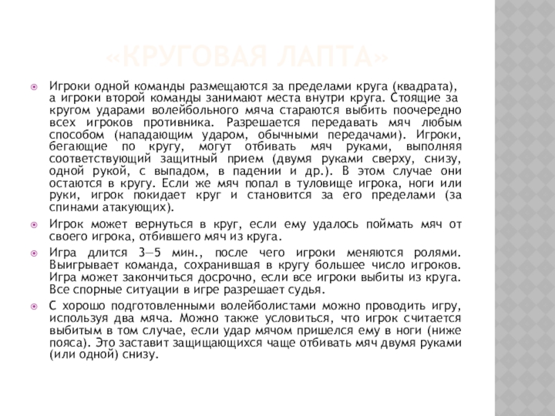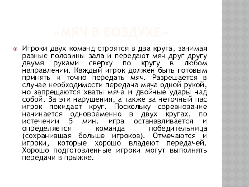 половины зала и передают мяч друг другу двумя руками сверху по кругу в любом направлении. Каждый игрок должен быть готовым принять и точно передать мяч. Разрешается в случае необходимости передача мяча одной рукой, но запрещаются хваты мяча и двойные удары над собой. За эти нарушения, а также за неточный пас игрок покидает круг. Поскольку соревнование начинается одновременно в двух кругах, по истечении 5 мин. игра останавливается и определяется команда победительница(сохранившая больше игроков). Отмечаются и игроки, которые хорошо владеют передачей. Хорошо подготовленные игроки могут выполнять передачи в прыжке.