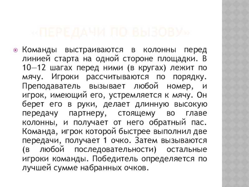 стороне площадки. В 10—12 шагах перед ними (в кругах) лежит по мячу. Игроки рассчитываются по порядку. Преподаватель вызывает любой номер, и игрок, имеющий его, устремляется к мячу. Он берет его в руки, делает длинную высокую передачу партнеру, стоящему во главе колонны, и получает от него обратный пас. Команда, игрок которой быстрее выполнил две передачи, получает 1 очко. Затем вызываются (в любой последовательности) остальные игроки команды. Победитель определяется по лучшей сумме набранных очков.
