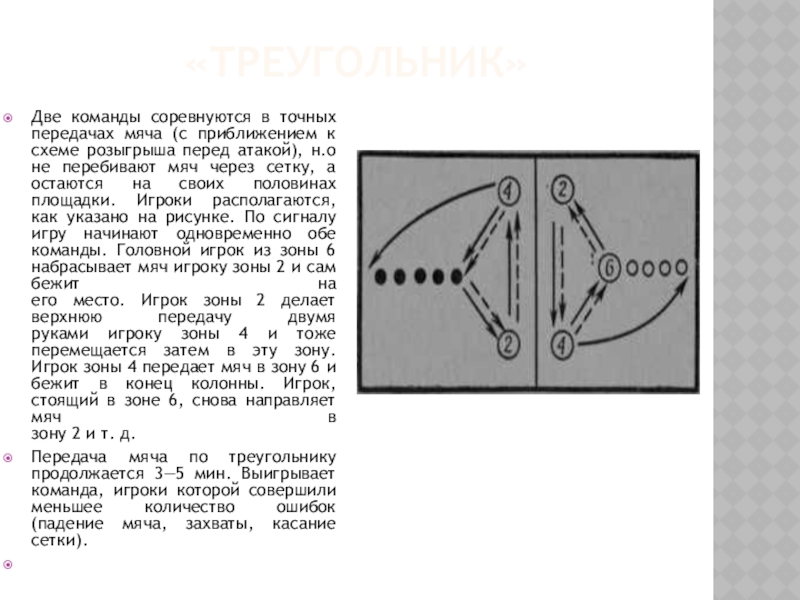 Передача мяча по треугольнику продолжается 3—5 мин. Выигрывает команда, игроки которой совершили меньшее количество ошибок (падение мяча, захваты, касание сетки).