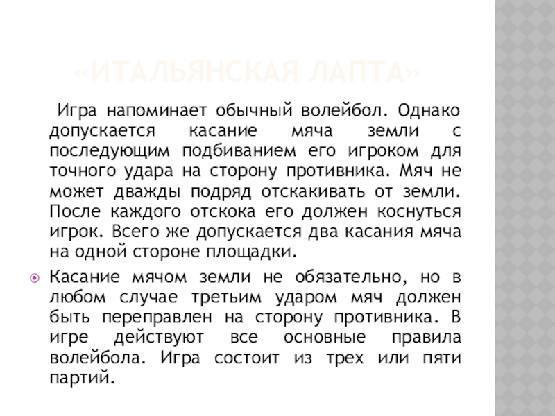 Игра напоминает обычный волейбол. Однако допускается касание мяча