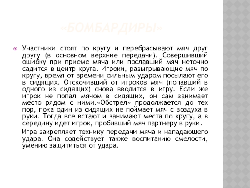 Игра закрепляет технику передачи мяча и нападающего удара. Она содействует также воспитанию смелости, умению защититься от удара.