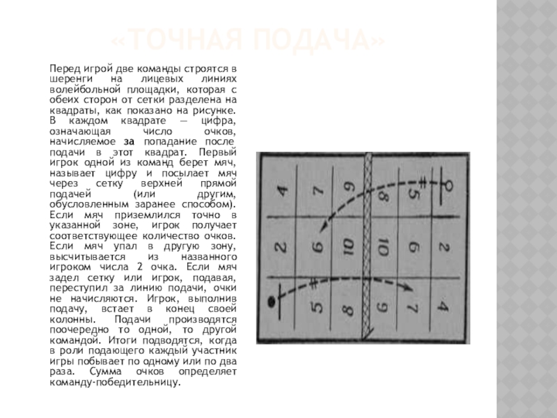 шеренги на лицевых линиях волейбольной площадки, которая с обеих сторон от сетки разделена на квадраты, как показано на рисунке. В каждом квадрате — цифра, означающая число очков, начисляемое за попадание после подачи в этот квадрат. Первый игрок одной из команд берет мяч, называет цифру и посылает мяч через сетку верхней прямой подачей (или другим, обусловленным заранее способом). Если мяч приземлился точно в указанной зоне, игрок получает соответствующее количество очков. Если мяч упал в другую зону, высчитывается из названного игроком числа 2 очка. Если мяч задел сетку или игрок, подавая, переступил за линию подачи, очки не начисляются. Игрок, выполнив подачу, встает в конец своей колонны. Подачи производятся поочередно то одной, то другой командой. Итоги подводятся, когда в роли подающего каждый участник игры побывает по одному или по два раза. Сумма очков определяет команду-победительницу.