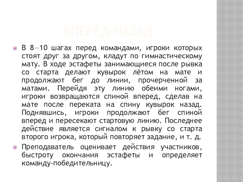 кладут по гимнастическому мату. В ходе эстафеты занимающиеся после рывка со старта делают кувырок лётом на мате и продолжают бег до линии, прочерченной за матами. Перейдя эту линию обеими ногами, игроки возвращаются спиной вперед, сделав на мате после переката на спину кувырок назад. Поднявшись, игроки продолжают бег спиной вперед и пересекают стартовую линию. Последнее действие является сигналом к рывку со старта второго игрока, который повторяет задание, и т. д.