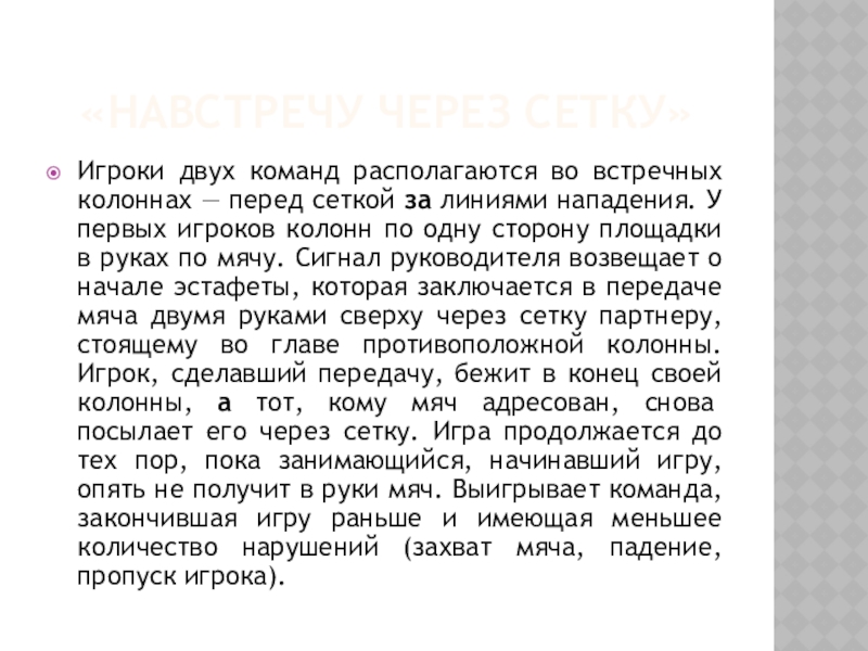 сеткой за линиями нападения. У первых игроков колонн по одну сторону площадки в руках по мячу. Сигнал руководителя возвещает о начале эстафеты, которая заключается в передаче мяча двумя руками сверху через сетку партнеру, стоящему во главе противоположной колонны. Игрок, сделавший передачу, бежит в конец своей колонны, а тот, кому мяч адресован, снова посылает его через сетку. Игра продолжается до тех пор, пока занимающийся, начинавший игру, опять не получит в руки мяч. Выигрывает команда, закончившая игру раньше и имеющая меньшее количество нарушений (захват мяча, падение, пропуск игрока).