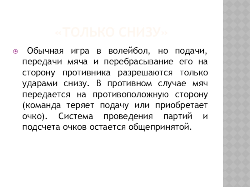 перебрасывание его на сторону противника разрешаются только ударами снизу. В противном случае мяч передается на противоположную сторону (команда теряет подачу или приобретает очко). Система проведения партий и подсчета очков остается общепринятой.