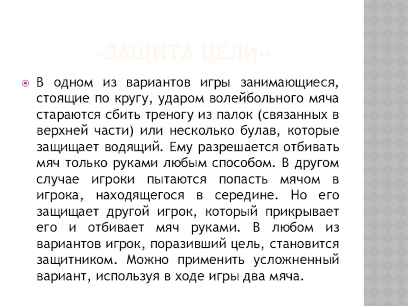 волейбольного мяча стараются сбить треногу из палок (связанных в верхней части) или несколько булав, которые защищает водящий. Ему разрешается отбивать мяч только руками любым способом. В другом случае игроки пытаются попасть мячом в игрока, находящегося в середине. Но его защищает другой игрок, который прикрывает его и отбивает мяч руками. В любом из вариантов игрок, поразивший цель, становится защитником. Можно применить усложненный вариант, используя в ходе игры два мяча.