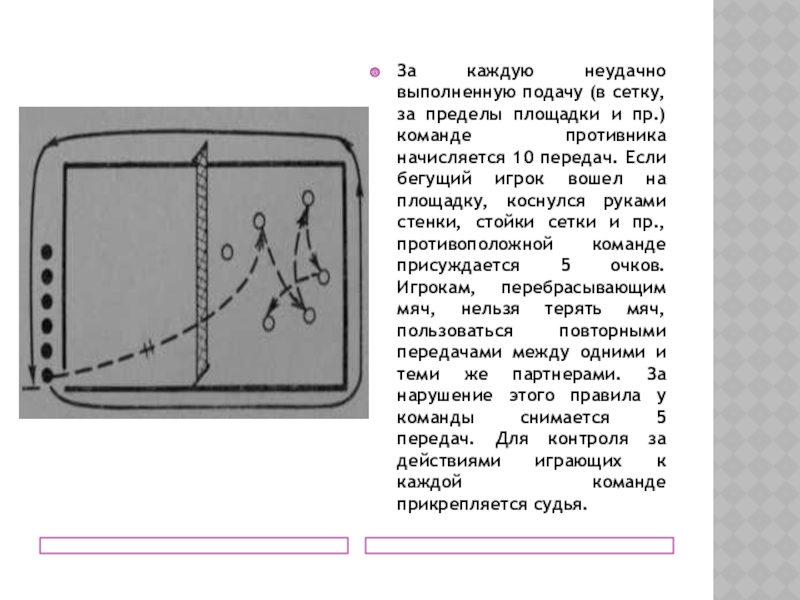пр.) команде противника начисляется 10 передач. Если бегущий игрок вошел на площадку, коснулся руками стенки, стойки сетки и пр., противоположной команде присуждается 5 очков. Игрокам, перебрасывающим мяч, нельзя терять мяч, пользоваться повторными передачами между одними и теми же партнерами. За нарушение этого правила у команды снимается 5 передач. Для контроля за действиями играющих к каждой команде прикрепляется судья.