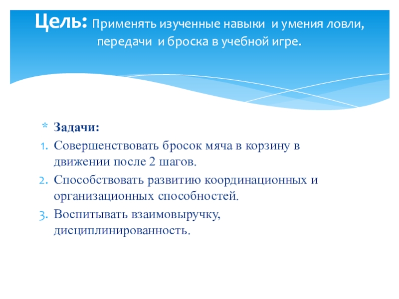 Цель: Применять изученные навыки и умения ловли, передачи и броска в учебной игре.