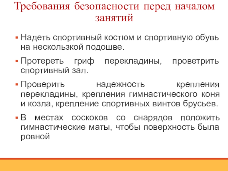 Требования безопасности перед началом занятийНадеть спортивный костюм и спортивную обувь на нескользкой подошве.Протереть гриф перекладины, проветрить спортивный зал.Проверить надежность крепления перекладины, крепления гимнастического коня и козла, крепление спортивных винтов брусьев.В местах соскоков со снарядов положить гимнастические