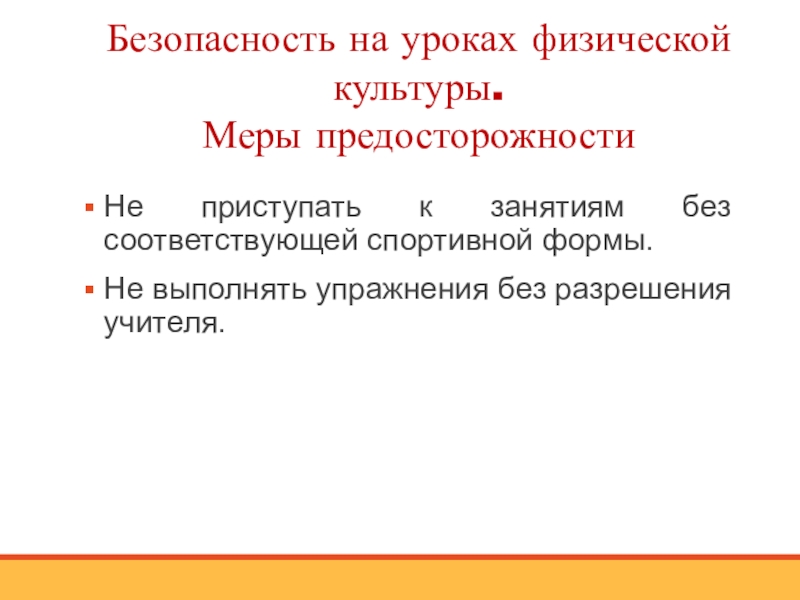 Безопасность на уроках физической культуры. Меры предосторожностиНе приступать к занятиям без соответствующей спортивной формы.Не выполнять упражнения без